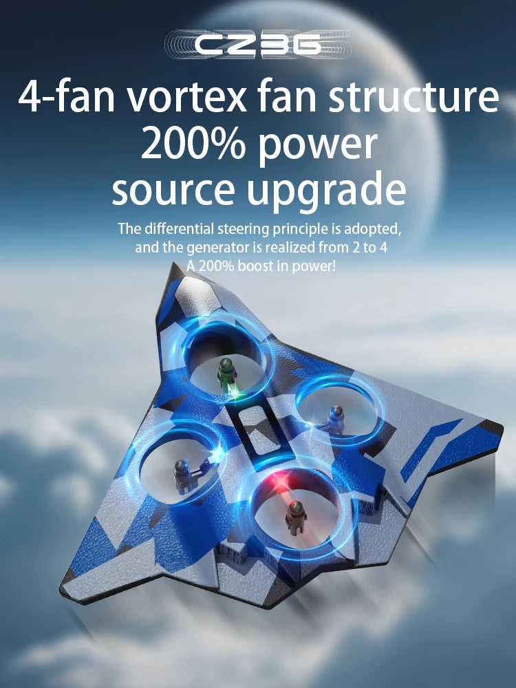 Powered by a 4-Fan Vortex Structure with 200% enhanced thrust, this jet delivers smooth, stable flights and jaw-dropping stunts. The intelligent fixed-height suspension makes flying incredibly easy—even for beginners.
